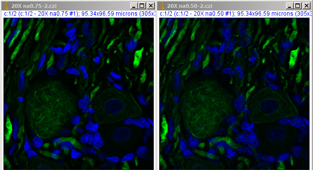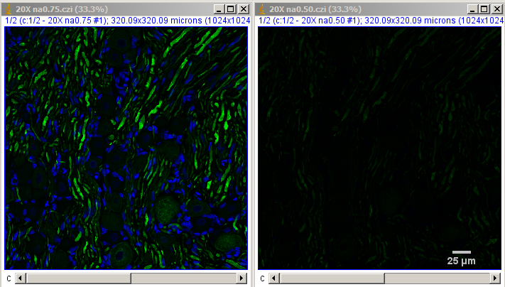 Laser, gain, pinhole settings exactly the same with both lenses.