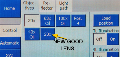 On the touch pad, the old lens is the button in the upper left (position 1) and the new lens is the 20x in the lower right (position 6).