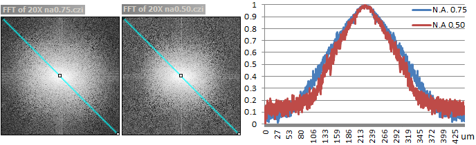 The point is that the new N.A. 075 lens (left) is brighter than the old N.A. 0.50 lens (right).
