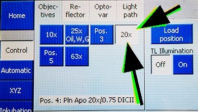 Again, this is an air lens. Make sure your coverslip is completely clean of fluids before using this lens. If you cannot get a good image with the lens, most likely someone got it dirty. It can only be cleaned by staff, so please let us know if you have any problems with it.