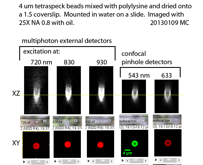 These tests suggest, surprisingly, that the wavelengths are focused at the same Z depth. These tests are not perfect because the imaging is superficial as in only right up against the coverslip. Perhaps mixing the beads with collagen and pouring into a MatTek dish to set would be a better test.