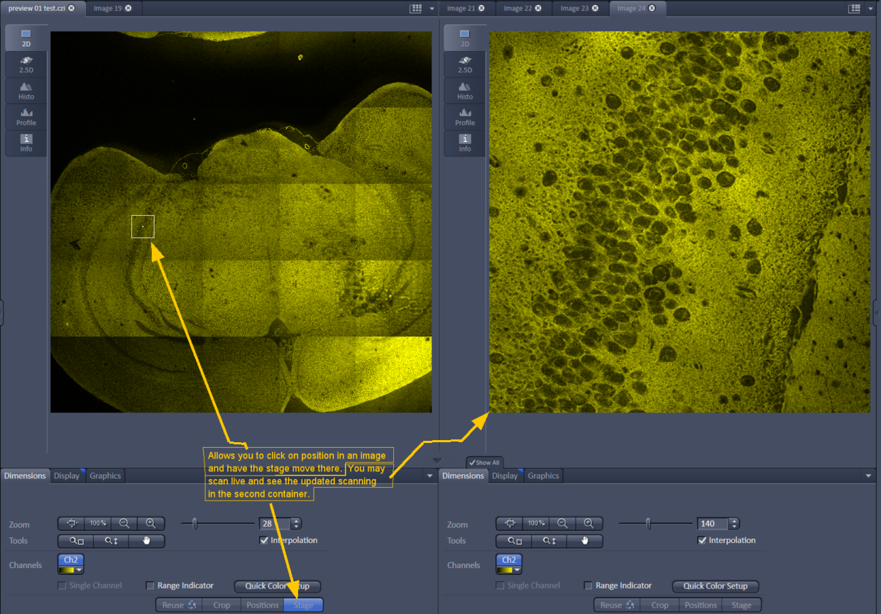 More advanced: send file to Zen Blue for more advanced stitching options. (Run Zen blue at the same time, File > Send to Zen Blue, or save file as CZI and reopen in Zen Blue)