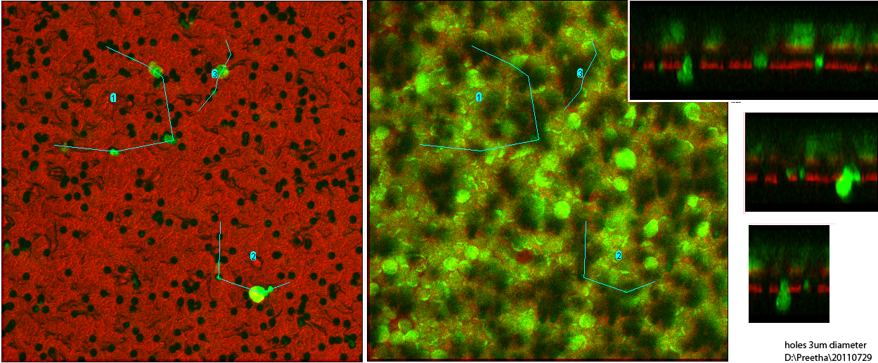 Cells were put in Costar Transwell Polycarbonate Membrane Permeable Supports EF5650C and EF5650B. Either they were prelabeled or stained post-fixation with fluorescent dye. Each well was removed from the original chamber and placed in a MatTek dish P35G-1.5-14-C on the microscope stage for imaging.