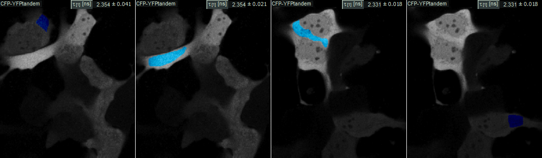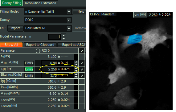 We are new at the Symphotime software. We simply drew ROIs on the images and did single exponential fits. The full results window looks like this and in the figures below we report the number in the yellow ellipse. These are encouraging preliminary data.