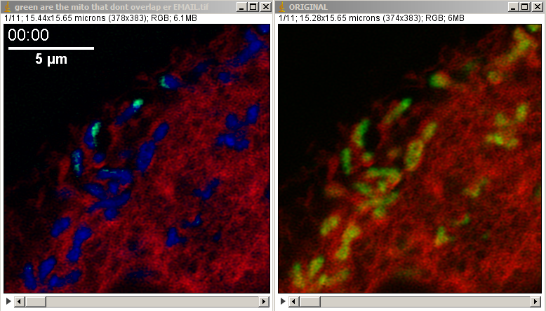 This is a possible method for looking for structures that overlap and do not overlap. Test is with mitochondria and ERZ as labeled with mitotracker and ER tracker.