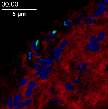This one shows the method works, but the reason the mitochondrion isn't overlapping with ER is because the mitochondria jumped faster than the two channel imaging. Or maybe it is real that the mitochondrion escaped the ER for up to 15 seconds. Who knows?