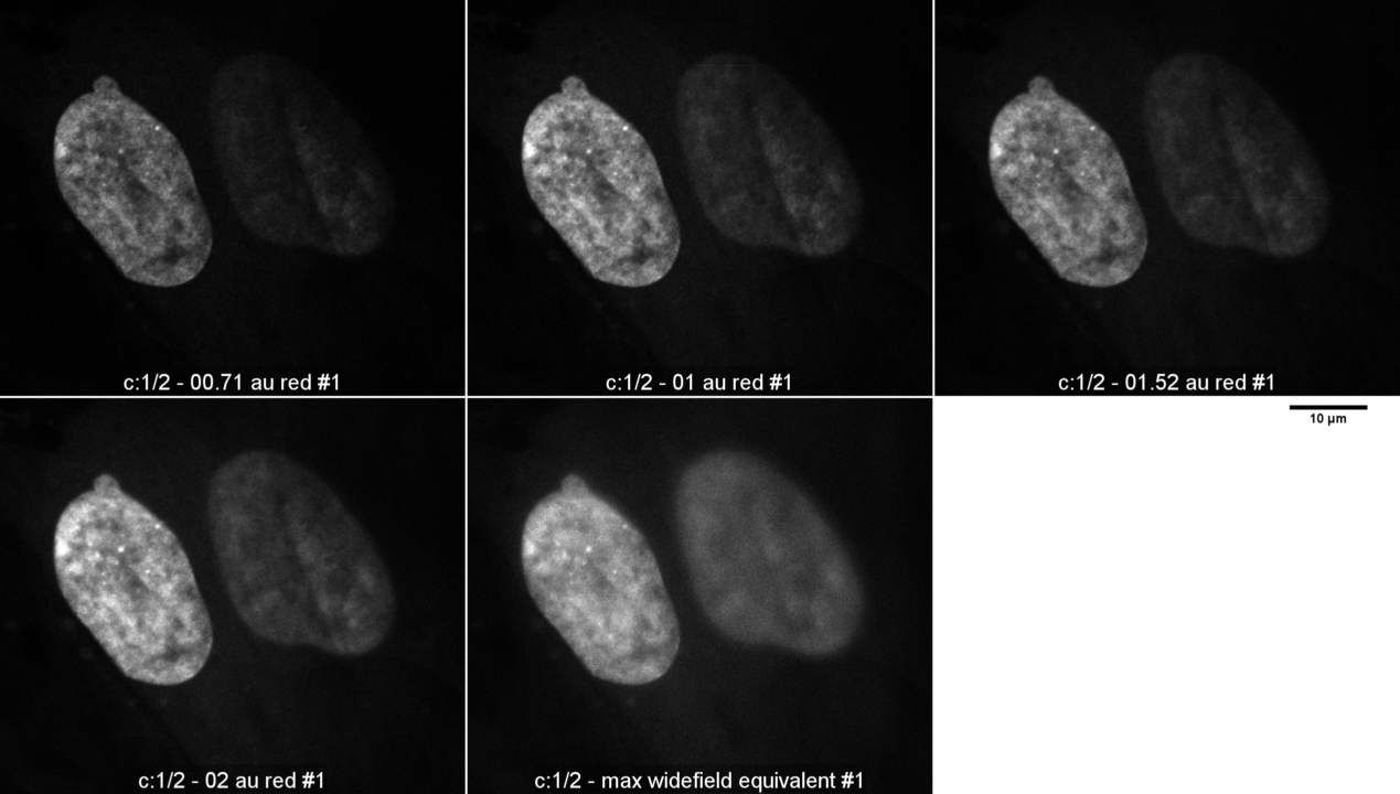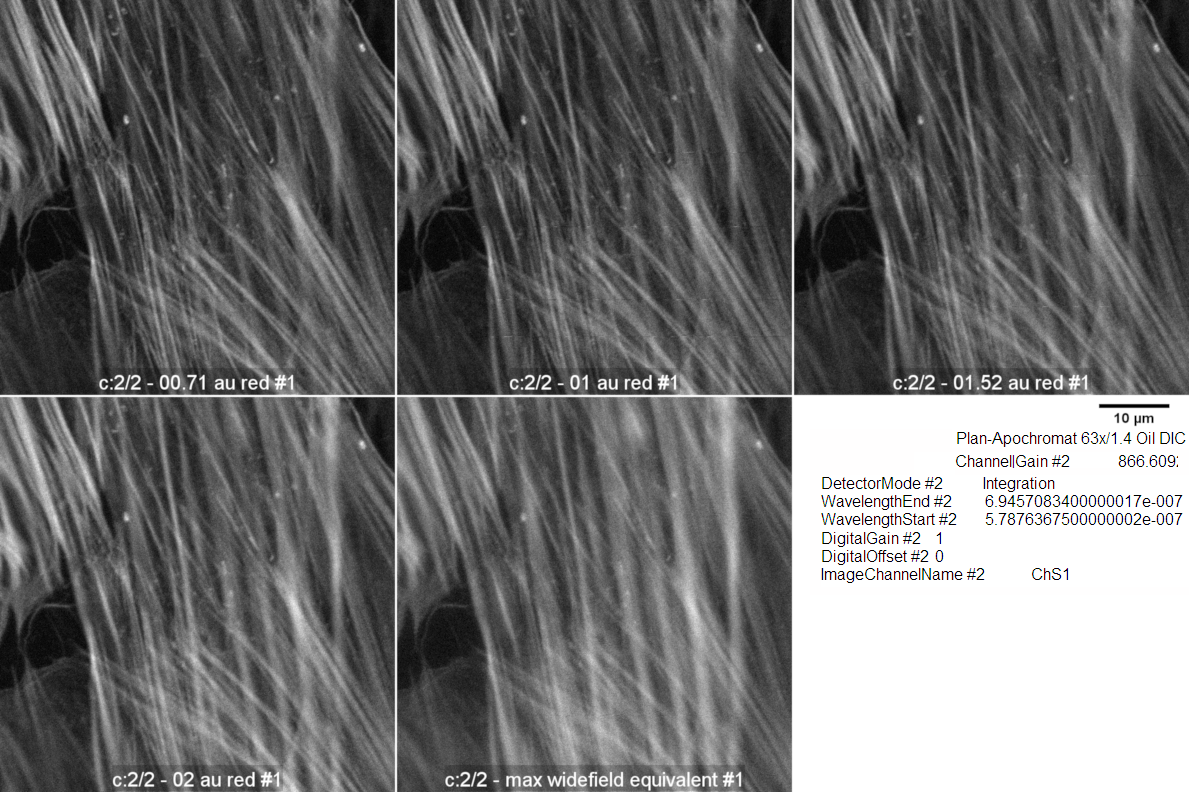 Images were taken with pinhole, as calculated by Zeiss Zen Black software, at 0.71, 1.0, 1.52, 2.0, and maximum opened. Laser was attenuated between pinhole settings. Gain, scan speed, averaging kept constant for all pictures. Original images 1024 x 1024 pixels oversampled at each pixel 0.07 um. Other metadata here.