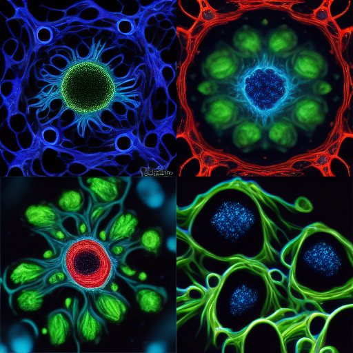 immunofluorescence of HeLa cell, 60X microscope lens, red microtubules, green mitochondria, blue vimentin, black background, white nucleus