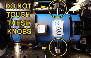 The DV2 splits the images through two separate filters so that two probes may be imaged with precise temporal and spatial resolution. The alignment is extremely sensitive and it is imperative that the alignment knobs not be touched except as the last step in a multi-step process that requires special training.