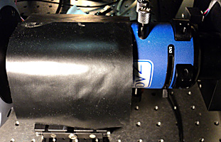3. Draping black dust-free cloth over the filter block prevents light leakage and protects the DV2 from dust.