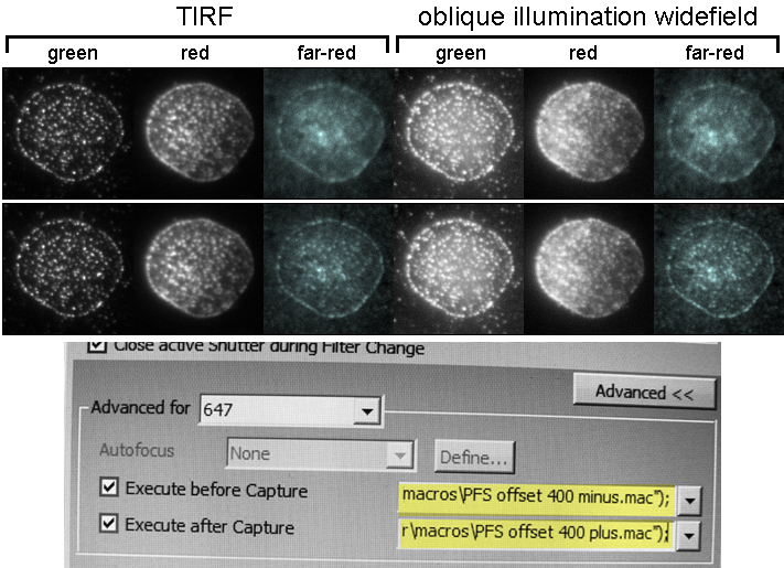 In the bottom row, where all the channels are in focus, we turned on the Advanced Settings in the Lambda ND Acquire window and set macros in the 647 (a.k.a. Cy5 or far-red) channel to shift the focal plane. Before executing the image capture, a macro shifts the focus 400 nm in the minus direction. After image capture, another macro shifts the focus back to the original Z axis position. You may find that 500 or 600 nm works better for you. For 405 or violet light, shift the focal plane in the plus direction first followed by minus to return to the original Z location.