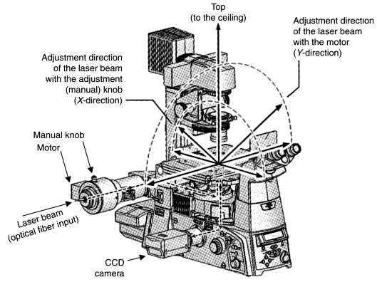 - Turn micrometer knob on top of TIRF arm above where the fiber enters ("Manual Knob" in picture above) to move the spot forward and backward.