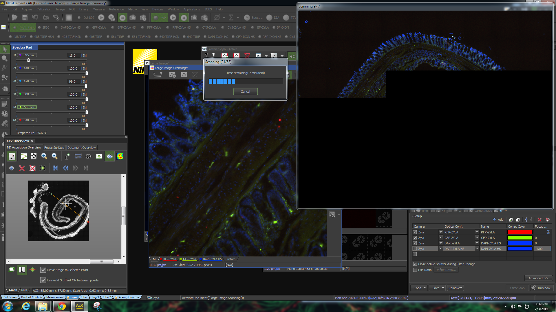 To get an overview scan a big field at low resolution (4X to 10X). Use the menu Acquire > Scan Large Image and position the lens near the center of the field to scan. This can be done by looking at the sample on the microscope stage. Choose a number of tiles likely to be bigger than the structure, such as 10 X 10 or 16 X 20. Also, turn off special stitching modes to speed up processing. And only image one channel.