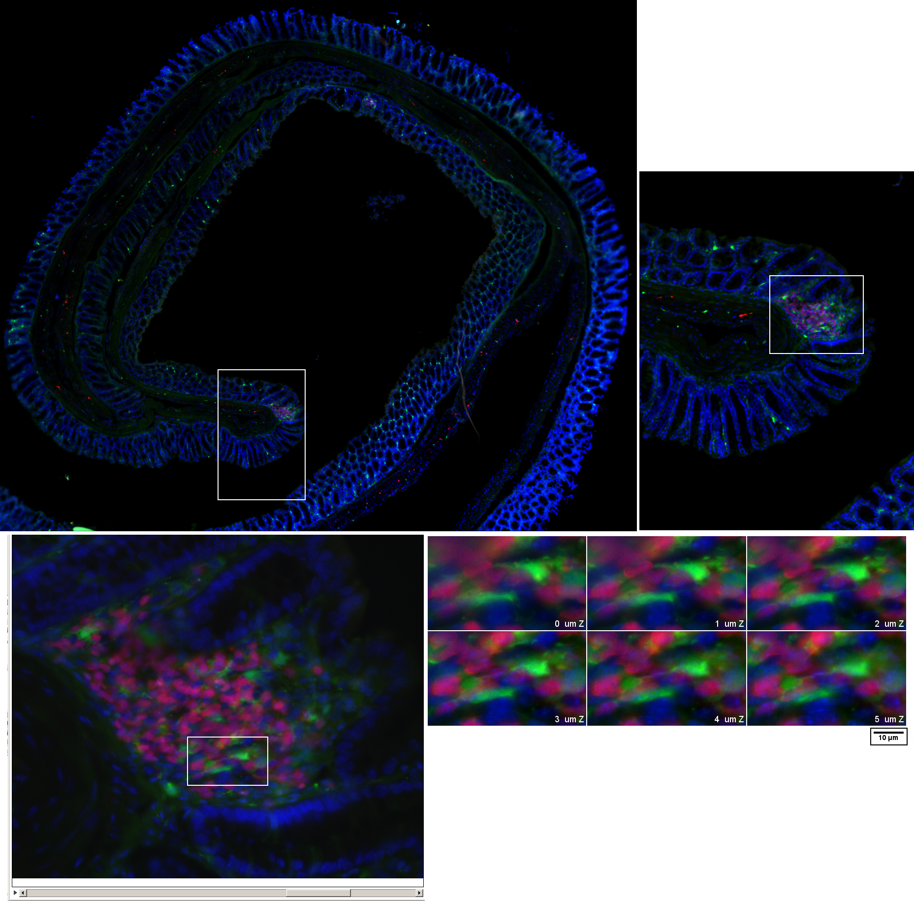 The image on the left is an overview of a large area. The outer portion was scanned at 10X. Then a smaller portion was scanned at 40X, which is the higher contrast rectangle inserted, and Elements software updated the overall scan. Don't worry about this; just look at the overall geography. You can zoom in and out using the mouse wheel between the two buttons.