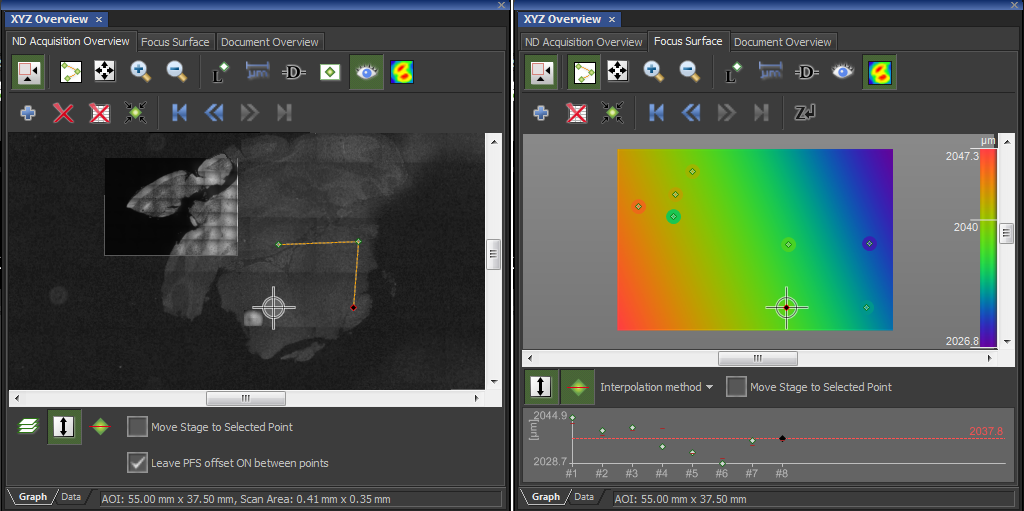 The image on the right shows focus weigh points. We can choose focus points by moving to any field (for instance by double clicking), focusing when in the live imaging mode, and adding the point using the blue plus sign icon. The color map show sthe relative shifts in focus.
