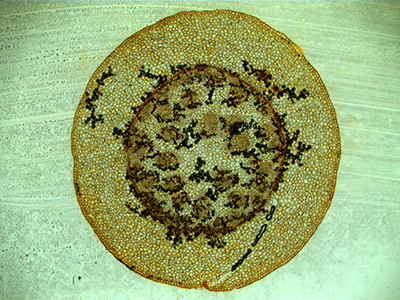 When microscope calibrated correctly (as of today 8 Mar 2017), you can focus at 4X (image at left) and then click on the 40X lens and be in the same location needing only a tweak of the focus (image at right).