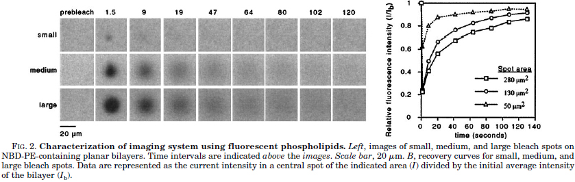 The user hit the run button on the computer. A bilayer was imaged for two timepoints at low laser intensity. The user closed the field diaphragm and clicked the continue button on the computer. The spot was blasted with the maximum laser light for 10 or 4 seconds. As soon as the user saw the laser shut off, he opened the field diaphragm because 10 seconds after the light shut off, the first of the recovery images was collected. (Depending on the user's skill at action computer games, this may be done consistently down to a second for finer timing.)