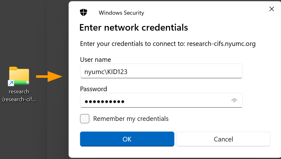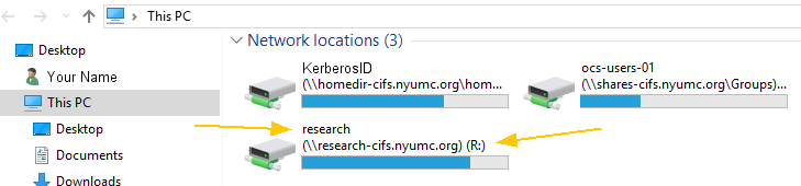 If you log in to your computer using KID, you should have access directly to the research server R: