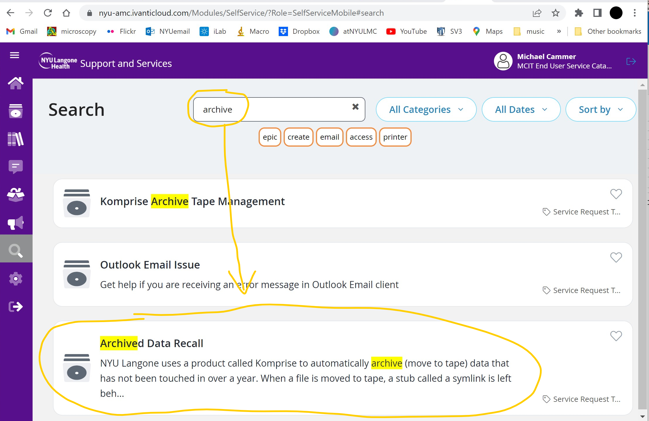 When a file is moved to tape, a stub called a symlink is left behind that has the original filename but a different extension and appears to take up little or no space. Under some circumstances you can double-click the file and it will be retrieved from tape, but it will take much longer than opening an unarchived file. In some cases it won’t open at all and that’s an instance where you should reach out to MCIT using this form. Another reason why you might need MCIT to do this for you is if you want to retrieve entire directories of files."
