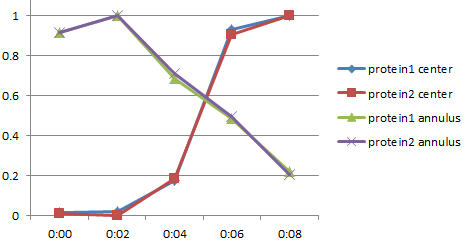 Here one region is a band at the outside of the cell and the other region is the central portion of the cell. It is clear that both proteins translocate from the annulus to the center at the same rate. They migrate together regardless whether they interact. (Yes, the intensities are normalized.)