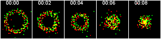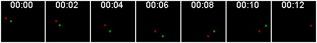 This series of images simulates a red and a green particle collected at precisely the same time. Two examples of simultaneous imaging are confocal where two detectors collect the colors at the same time and a beamsplitter that projects the two different colors onto different sides of the same camera that takes frame snaps that are not progressive.