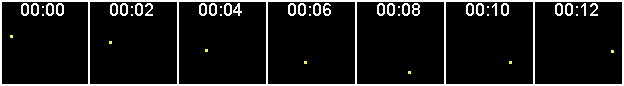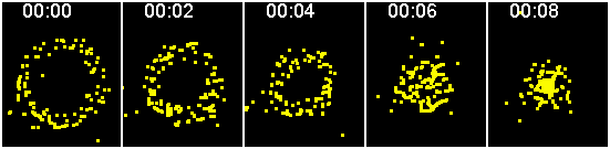 If the particles are dense enough, radial profile plots may track the movement of an ensemble. In the below graphs, the top graph is time 00:00 going down to the bottom which is 00:08. From left to right is spatial, from the cell center to the periphery. And the Y axis is intensity. Note that the intensity scale changes and at 00:08, there is a plateau in the graph at the center of the cell; this is saturation.
