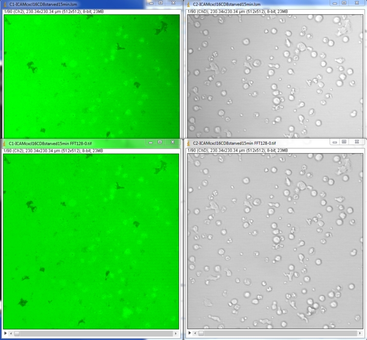 Here is an example where the raw data (top images by Maria Grazia) have uneven illumination from left to right. The raw data are 512X512 pixels. By applying a high pass filter from 128 to 0 pixels, the low frequency variation is removed; the resulting bottom images are flatter.