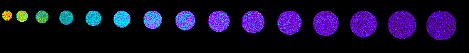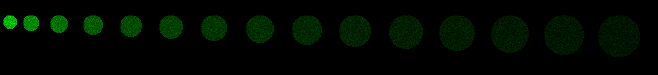 Load the green image above into ImageJ. You may be able to drag and drop it directly from this web page. Convert to 8 bits and measure each spot. The integrated intensity should remain approximately constant.