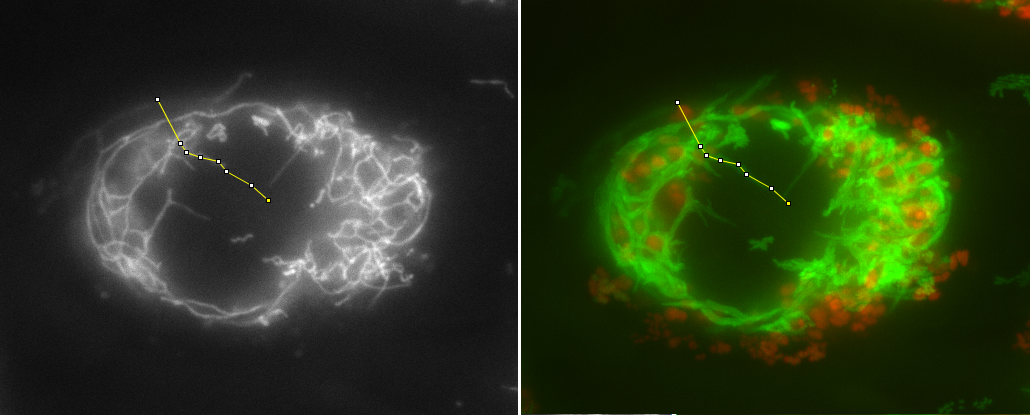 Single timpoint of cell at left and max projection through tiepoints at right. ROI for kymogram marked in yellow. (Scalebar in movie below.)