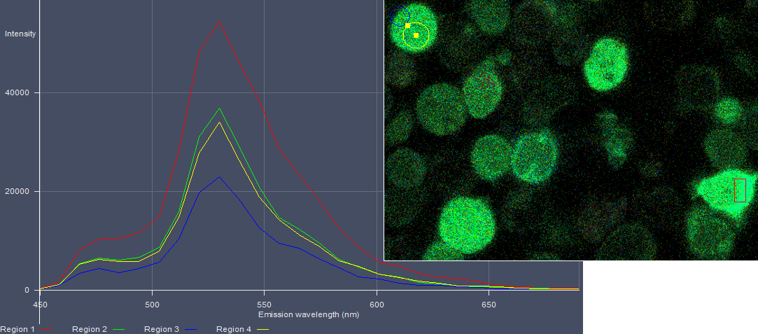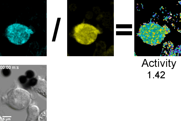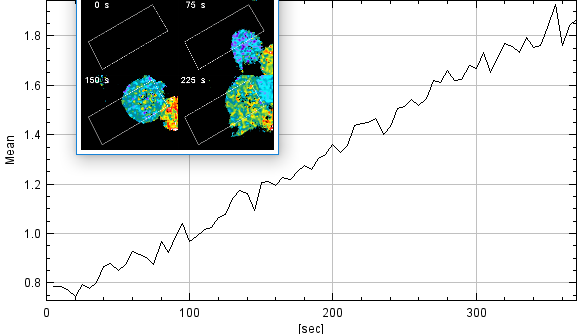 Here is another example with a graph, however, the increased ratio is due to bleaching of one fluorescent protein at a different rate than the other. This was an early try and settings had to be changed to avoid the bleaching issue. Also, bleaching curves may be characterized and included in the formula for calculating the ratio, but this requires standard settings and cells with similar expression levels of FPs.
