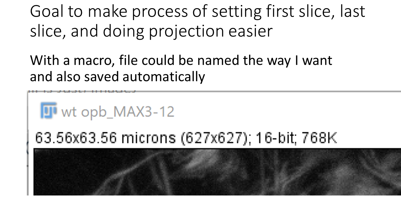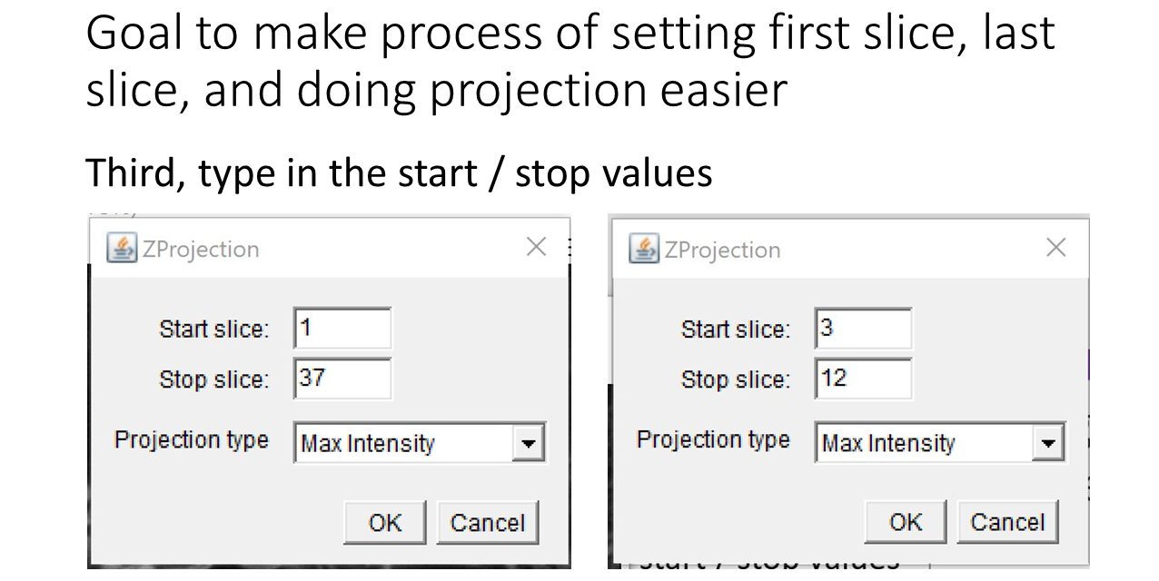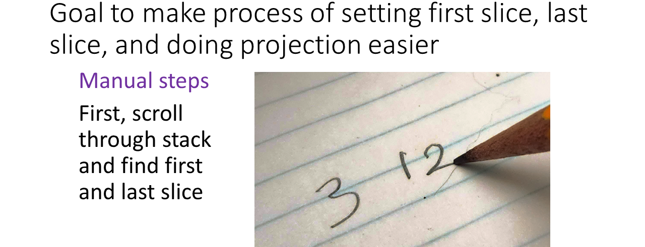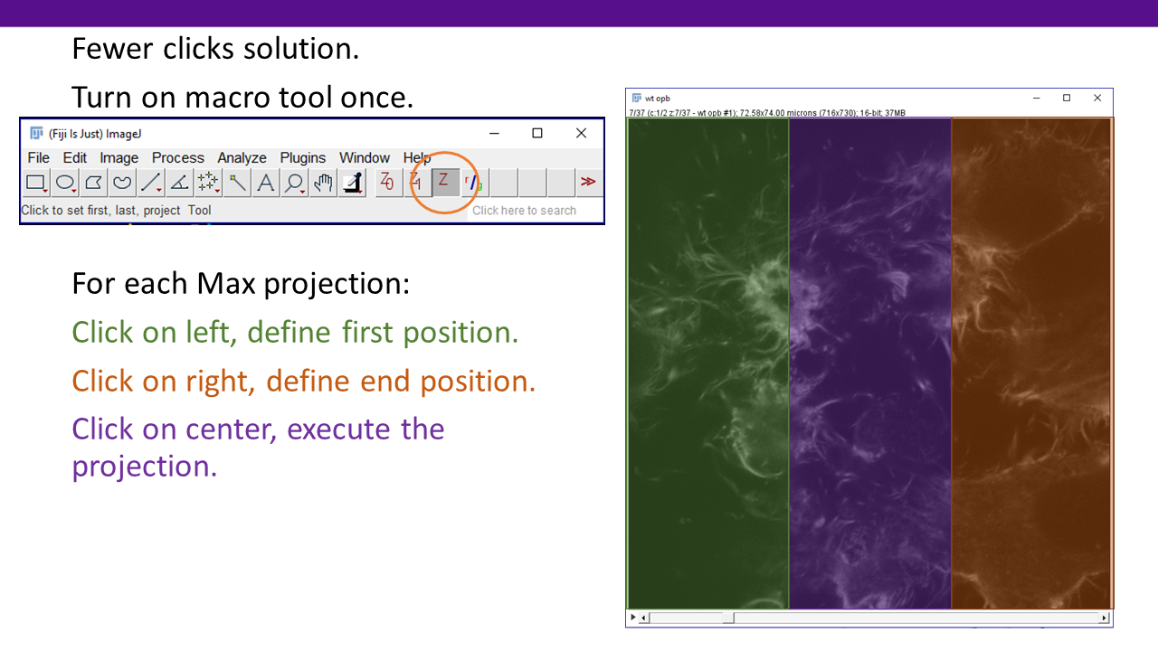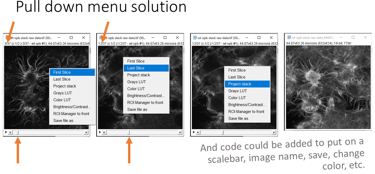The following slides are from the talk explaining the different methods. The first slides show how the Z projections are done manually. This can get tedious. Methods are shown to make this easier using macros with pull down menu, F keys, right click pull down menu, and (my favorite) an all click in mapped regions method.