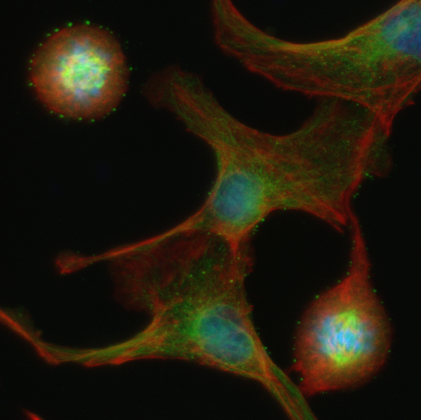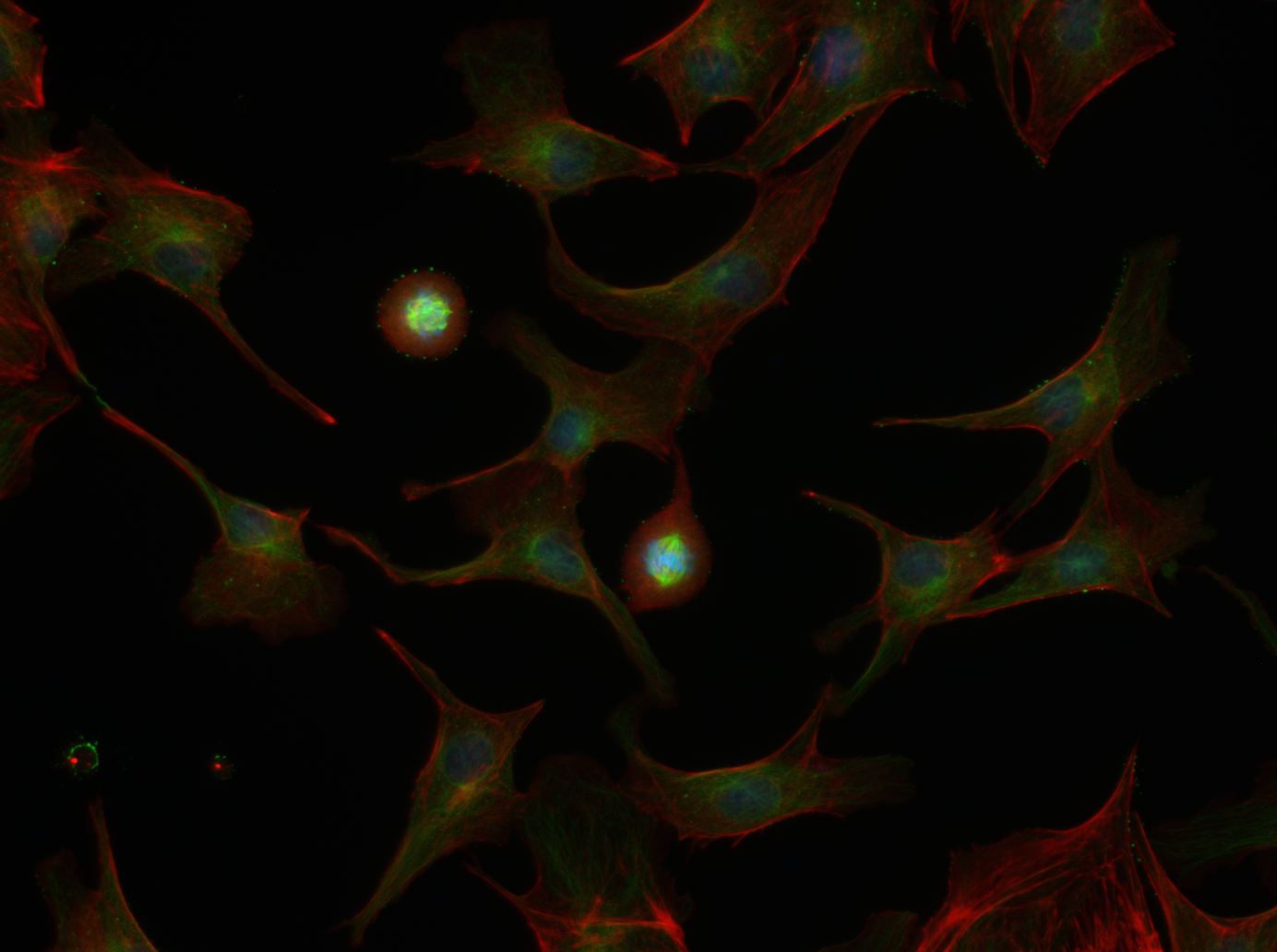 Example image of f-actin (red), tubulin (green), and DNA (blue) using the 40X N.A. 0.75 lens. Nuclei are approximately 10 um diameter.