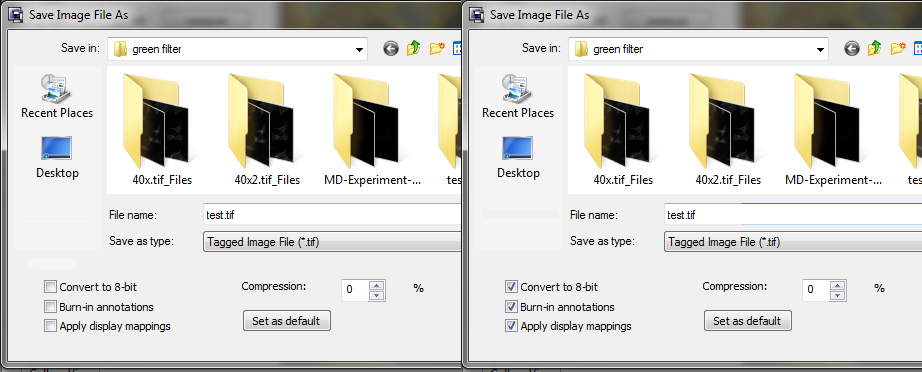 - If you save as TIF and want to save raw data for quantification of intensities, make sure you unclick the boxes as pictured. Setting to convert to 8 bits and/or apply mappings will lose the raw data.