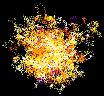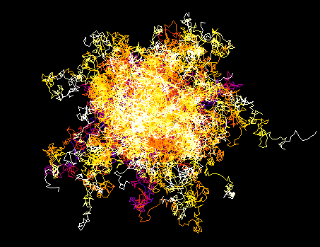 This is a maximum pixel projection of 100 random walks simulated with this macro in ImageJ.