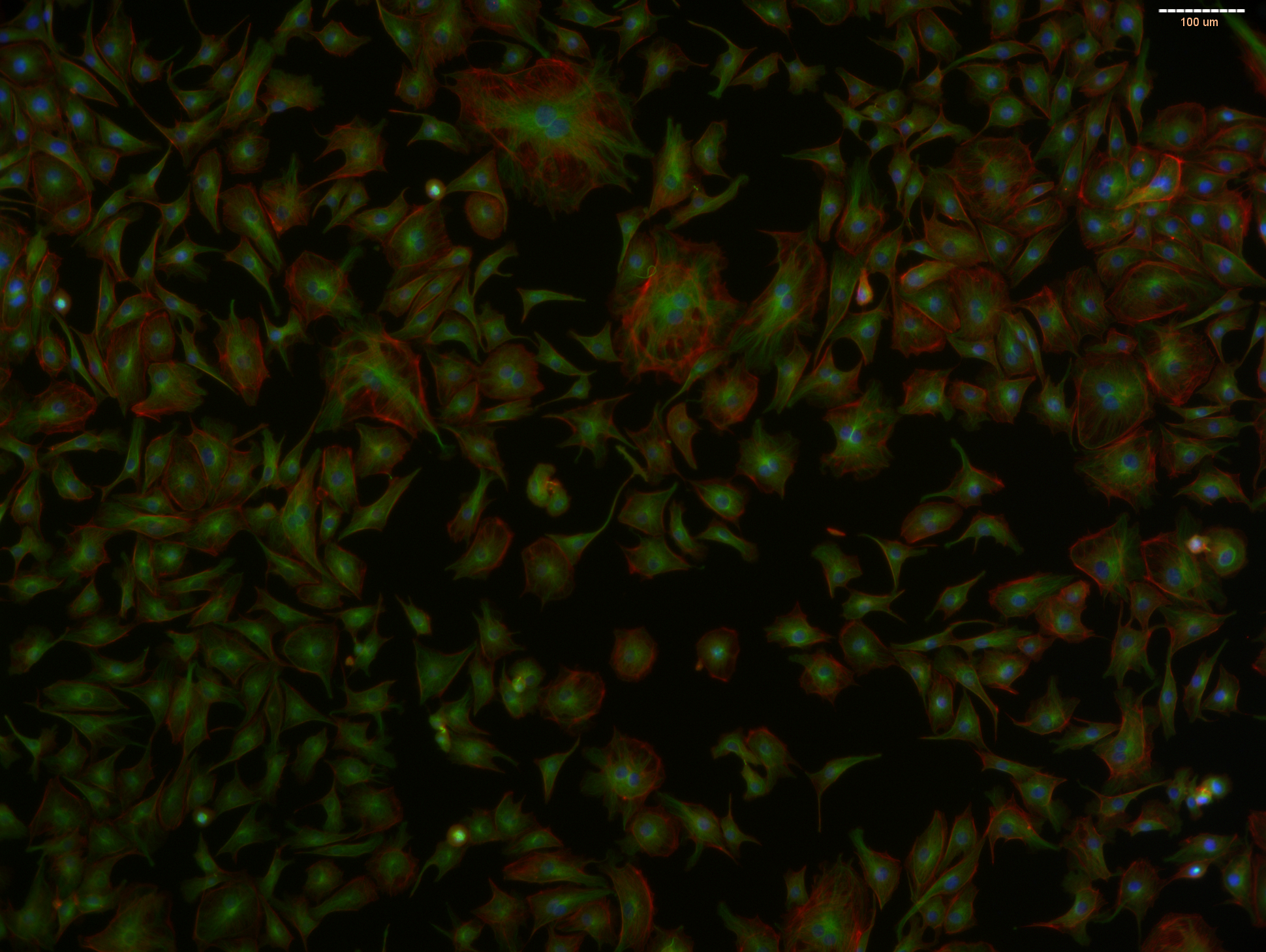 From left to right: DNA, tubulin, f-actin, merged of Molecular Probes prepared sample F14781.
