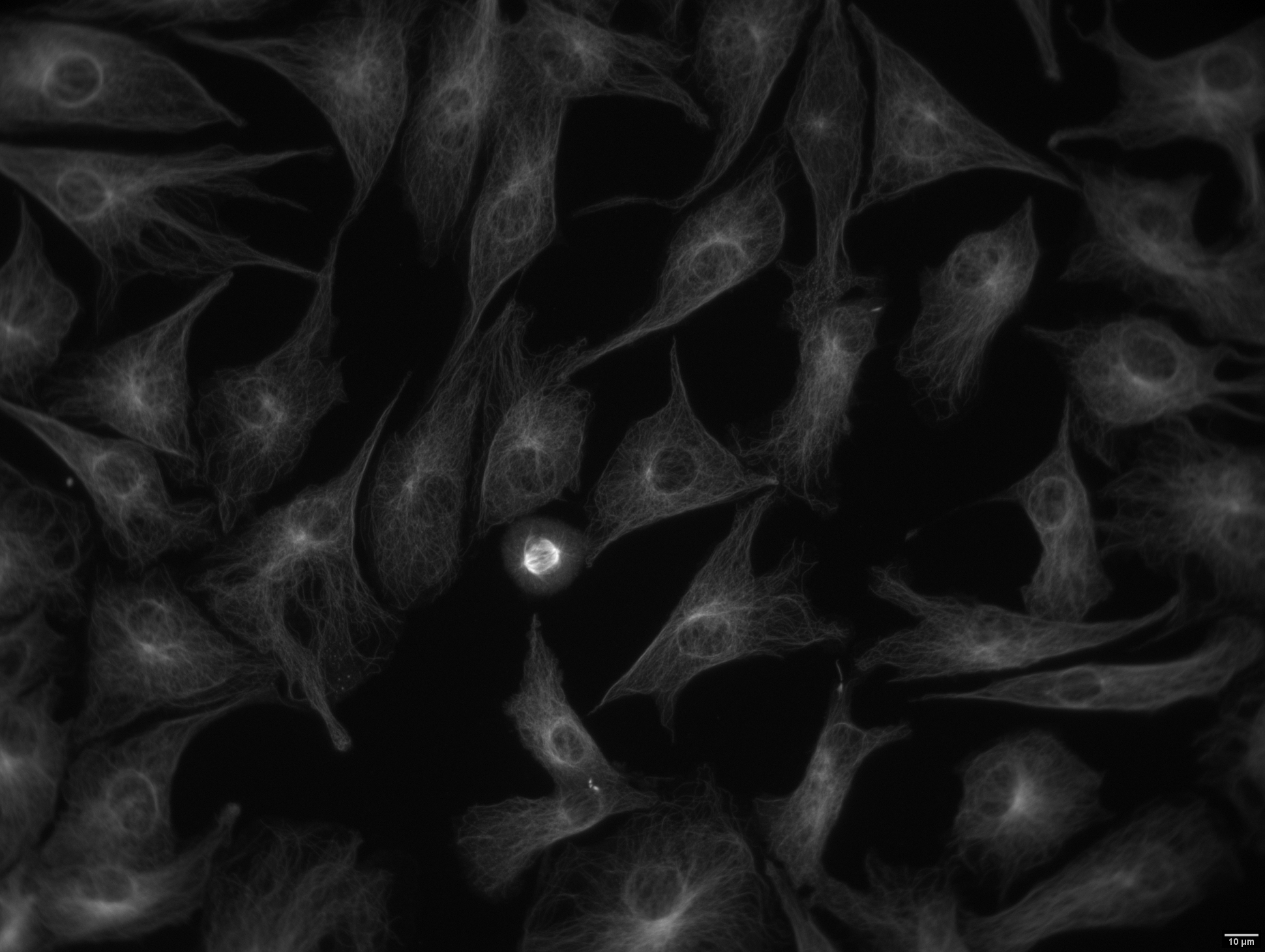 40X N.A. 0.65 lens full size image of tubulin staining and the full size image that the montage was cropped from. Notice that the corners of the full field image are a little fuzzy. But the center looks good.