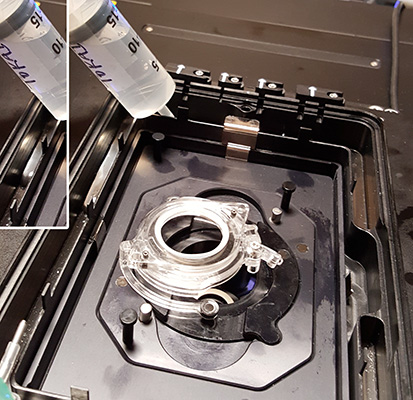 The chamber should be hydrated. The manual suggests 26 ml of distilled water in the metal trough at the perimeter of the stage insert.