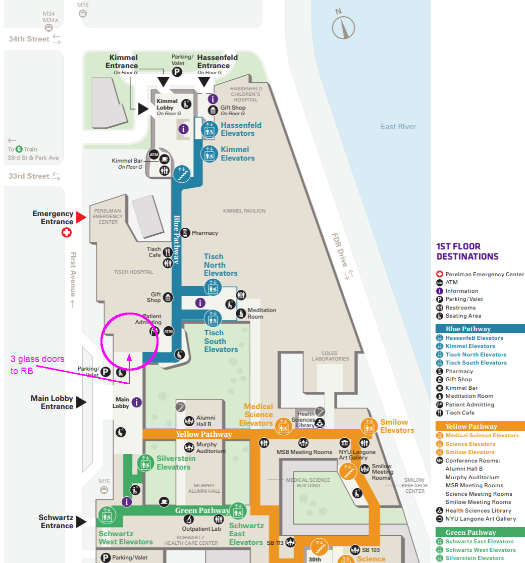 There is also a back way in by walking through Tisch Hospital on the 3rd, 4th, and 5th floors.