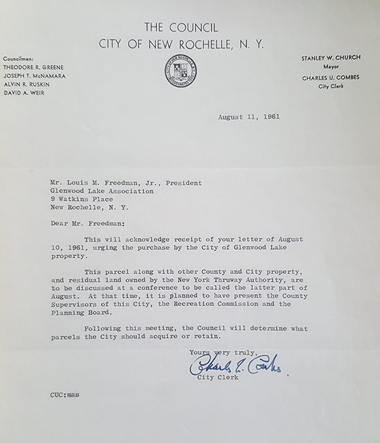New Rochelle was considering turning down the offer of land to instead have it auctioned off. GLA pushed for a public park. (There is another letter, not found in these files, that says that after New Rochelle took possession of the land, none of it was to be transferred to private ownership. However, it appears that parcels were subsequently sold or title otherwise transferred in violation of the agreement.)