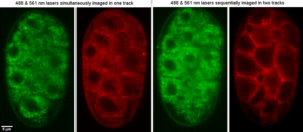 If there are spillover problems and you can image a little slower, you can set up tracks such that different laser and filter combinations are imaged in sequence. In the following example where on the left the green signal spills over into the red channel when both the 488 and 561 nm lasers are illuminating, the images on the right show a track with 488 nm alone and camera 1 followed by 561 nm alone and camera 2. In this case, no filters were changed so mode "Frame Fast", but filter changescan be effected too although relatively slow. Also, two tracks have the benefit that the two cameras may have different exposure times.